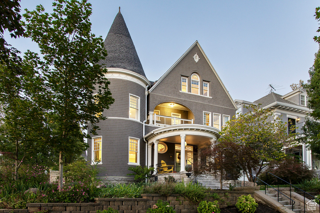Set on one of Salt Lake City's most storied streets, this Utah Historic Registry home represents the best of classic architecture reimagined for modern living. Perfectly positioned on a quiet portion of this tree-lined stretch of East South Temple, this regal estate offers a rare blend of history, privacy, and refinement conveniently located near the University, downtown, and the city's cultural heartbeat. A gated, secure driveway tucked off a private lane ensures ease of access while maintaining a sense of seclusion. The home's stately columned front porch, mature trees, and master gardenerdesigned landscaping create a picture-perfect welcome, while its distinctive shingle siding evokes timeless East Coast elegance. Inside, the main level exudes warmth and character, with rich hardwood floors, exquisite millwork, and leaded glass windows. Pocket doors open to formal living and study spaces, and a charming powder bath with playful wallpaper adds a touch of whimsy. The formal dining room connects seamlessly to both the kitchen and living room, creating an ideal flow for entertaining. The renovated kitchen honors the home's heritage while incorporating modern convenience, featuring custom cabinetry, built-in storage, and a charming pantry hidden behind an original wood door. A new mudroom provides everyday functionality with direct access to the two-car garage and gated drive. Beyond the interior, the backyard is a private retreat designed for year-round enjoyment. A paver deck anchors the outdoor living space, complete with an outdoor kitchen, fireplace, and a covered lounge area outfitted with power, lighting, shades, and a ceiling fan, perfect for relaxation throughout the seasons. Fully gated and thoughtfully designed, the backyard offers room to dine, lounge, and play without interruption, creating a true extension of the home's living space. The second level is anchored by an inviting primary suite within the home's turret, offering a cozy reading nook framed by arched windows, a gas fireplace, and a marble-clad bathroom with dressing room, laundry, and balcony access. Additional bedrooms on this level include en suite baths, built-ins, and architectural details that capture the home's character. The third floor surprises with a sun-drenched office surrounded by walls of windows, framing views of the hillside and surrounding historic neighborhood. This level also features two additional bedrooms, each with charming window seats, built-ins, and their own private lofts, along with a full bath with dual vanity. The lower level reveals the home's rich history and incredible charm, with exposed brick walls, a gas fireplace, a cozy den, an original bank vault door leading to storage, and a spacious laundry room showcasing new mechanical systems. Every inch of this exceptional home reflects the thoughtful care and craftsmanship of its stewards. Beautifully landscaped grounds, a sense of privacy set back from the street, and the unique combination of architectural significance and modern ease make this a truly once-in-a-lifetime opportunity on South Temple.